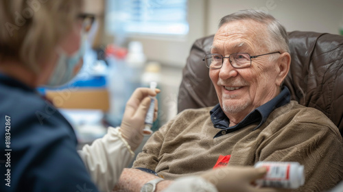 An elderly man in glasses smiles warmly while receiving medical care from a healthcare professional in a clinical setting.