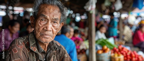 An elderly man looks directly at the camera while sitting at a market. AI.