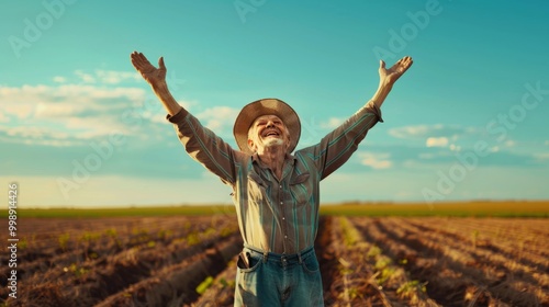 freedom, joy, field, nature, gratitude, palmy, happiness, outdoors, celebration, rural scene, smiling, joyful, hat, serenity, content, peace, open air, sunlight, rustic, countryside, farmland, casual attire, senior citizen, outdoorsman, optimism