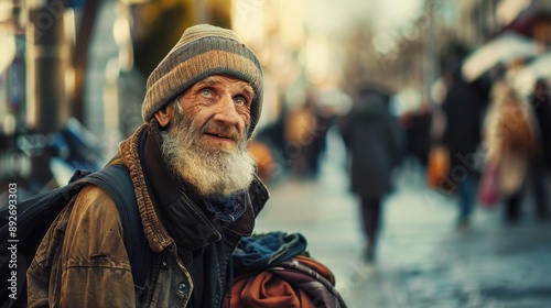 elderly, man, long, white, beard, striped, beanie, brown, jacket, backpack, content, expression, street, scene, blurred, figure, warm, gold, hue, setting, sun, seasoned, traveler, homeless, individual, introspection, hope, bustling, bustle, city, life, old