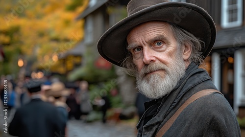 man, elderly, beard, white, grey, hat, coat, dark, street, cobbled, town, historic, autumn, leaf, foliage, portrait, closeup, weathered, face, attire, period, setting, quaint, historical, background, mature, long, old, person, male, gentleman, vintage, retro, look, expression, serious, pensive, thoughtful, wise, village, building, house, fall, season, colours, yellow, orange, winter, texture