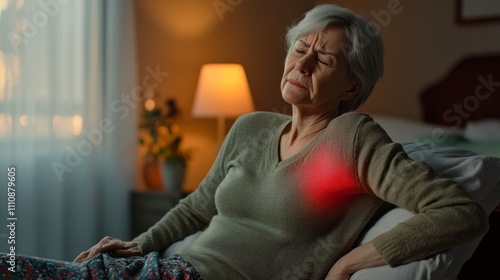 An elderly woman sits on her bed, showing signs of discomfort. The soft light from the lamp illuminates her worried expression as she places a hand on her chest
