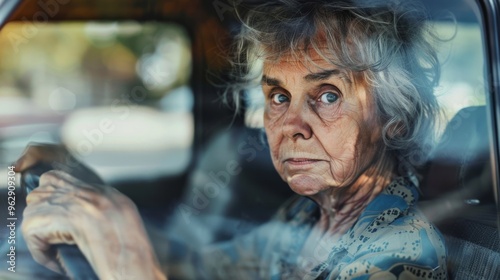 An elderly woman sits poised behind the wheel of a car, her expression both focused and introspective as she grips the steering wheel.