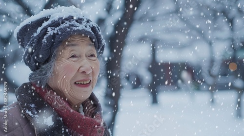 An elderly woman, warmly dressed, smiles as she enjoys the snowfall in a serene outdoor setting, with snow-covered trees in the background, embodying seasonal joy.