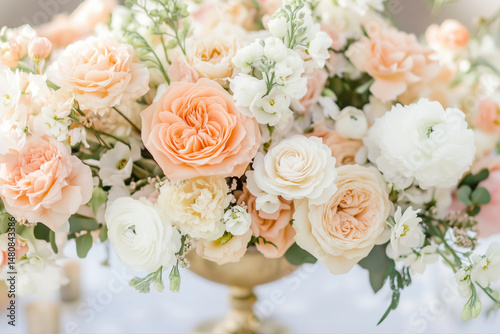 An elegant arrangement of white and pink roses in a luxury bouquet in a gold vase