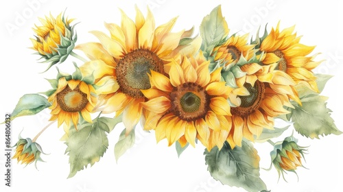An elegant bouquet of sunflowers, meticulously hand-drawn in watercolor style, ideal for a wall sticker. The intricate details and vibrant colors bring life to any space