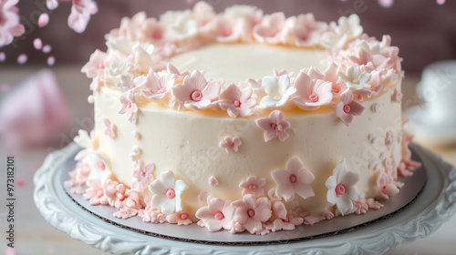 An elegant cake adorned with delicate fondant flowers in pastel tones, placed on a decorative stand