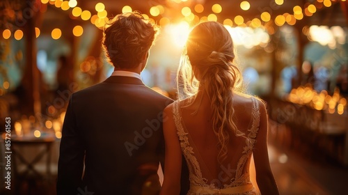 An elegant couple steps hand-in-hand towards their wedding venue, illuminated by the golden glow of the sunset and surrounded by warm string lights, symbolizing love and harmony.