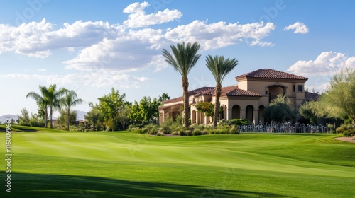 elegant, golf, course, groomed, scenic, view, club, neatly, lined, up, picturesque, clubhouse, sporting, elegance, style, photo, leisurely, grace, precision, high, quality, image, capturing, serene, beauty, golfing, landscape