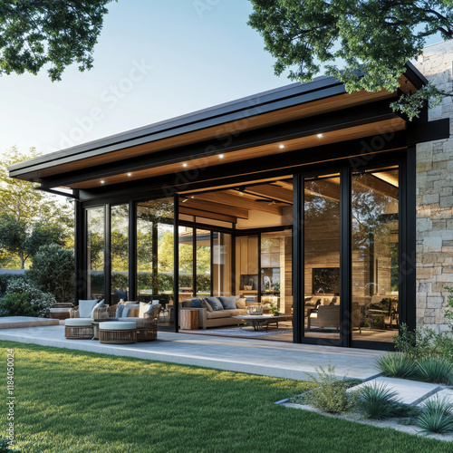 an elegant, modern-style patio cover in the backyard of a beautiful home