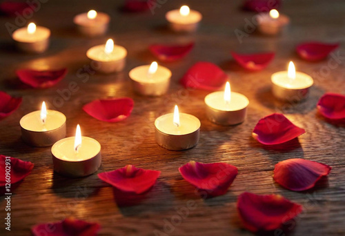 An elegant photo capturing a serene ambiance of candles lit in various heights, scattered among fresh red rose petals on a polished wooden surface. The soft light of the candles casts delicate shadows