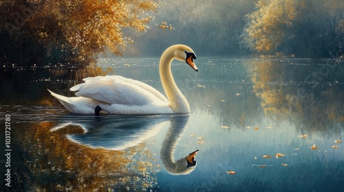 An elegant swan floats serenely on a still lake, its reflection shimmering on the water's surface, embodying grace and beauty.