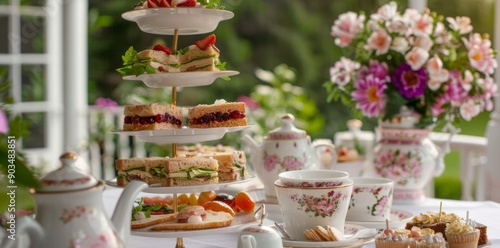 An elegant tea party featuring tiered sandwich platters and vintage teacups, set in a beautiful garden.