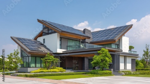 An elegant two-story modern house with sloped roofs covered in solar panels, white walls, large glass windows,