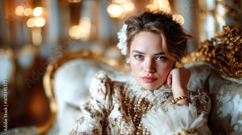 An elegant young woman poses gracefully in an opulent setting, showcasing her luxurious attire and emphasizing beauty, grace, and sophistication in a refined aesthetic.