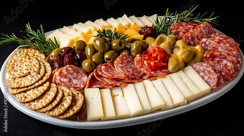 An elegantly arranged charcuterie board with cheeses, cured meats, crackers, and olives. The cheeses are cut into bite-sized pieces, creating a balanced and attractive display.