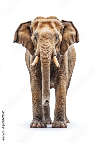 An elephant with tusks standing in front of a white background. Suitable for various applications