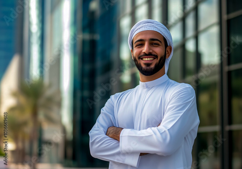 An Emirati man wearing a white Kandra, professional attire with arms crossed and smiling at the camera in front of a modern office.