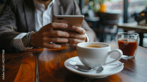 An employee and entrepreneur in a coffee shop typing and texting a contact for schedules and deadlines, sitting with morning tea and espresso on the phone to message a client.