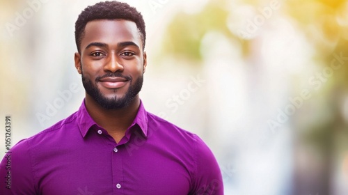 An empowered man with black hair in a vibrant purple shirt stands straight against a white background, ready for a promotional campaign with ample space for text.