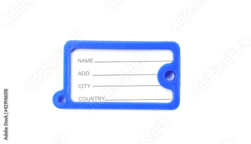 An empty badge with the fields Name, add, city, country is isolated on a white background. Copy space for text