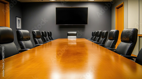 An empty boardroom awaits important decisions, a polished mahogany table reflecting the anticipation, under the cool glow of a large screen.