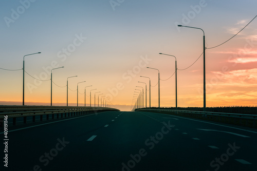 road, highway, sunset, light, sky, nature, travel, landscape, trip, background, drive, asphalt, way, nobody, dusk, route, orange, colourful, street light, twilight, lamp-post, evening, cloud, transportation, empty, expressway, mist, freedom, journey, desert, beautiful, sun, summer, autumn, pathway