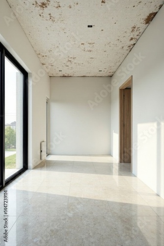 An Empty Room with Large Windows and a Distressed Ceiling, Offering Ample Natural Light and a Minimalist Aesthetic for Interior Design Inspiration