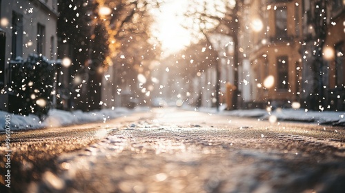 An empty scene featuring (a serene moment with snowflakes falling on a quiet street), creating an ideal product mockup space,