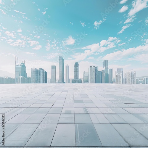 An empty square floor with a city skyline and modern buildings beneath a blue sky. Generative AI