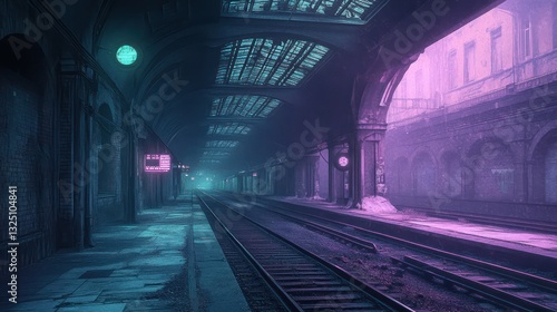 architecture, railway, track, platform, station, travel, urban, city, transportation, tunnel, perspective, rail, steel, gradient, neon, glow, light, darkness, building, structure, pathway, concrete, empty, space, eerie, fog, mist, atmosphere, underground, journey, vanishing, point, infrastructure, arch, brick, texture, detail, long, distant, waiting, quiet, abandoned, digital, artistic, retro, vintage, mysterious, futuristic