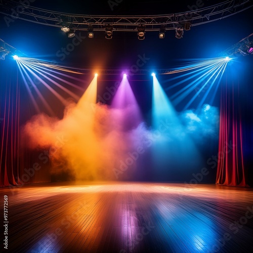 An empty theater stage awaits, bathed in the warm glow of bright spotlights. The dramatic lighting sets the scene for a captivating performance, inviting imagination and anticipation.