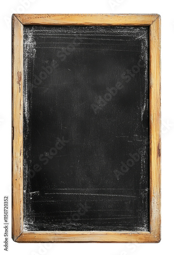 An empty vertical black chalkboard with a wooden frame, isolated on transparent background. Perfect for educational design themes