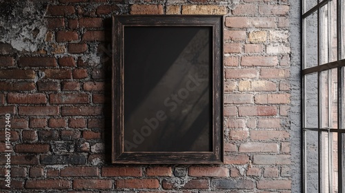 An empty vintage frame against a rustic brick wall, illuminated by natural light from a nearby window.