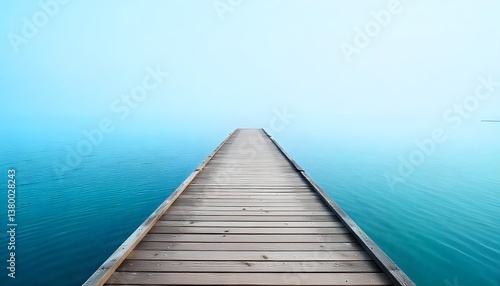 An empty wooden pier extending into a calm blue sea, with soft ripples on the water surface, perfect for summer concept