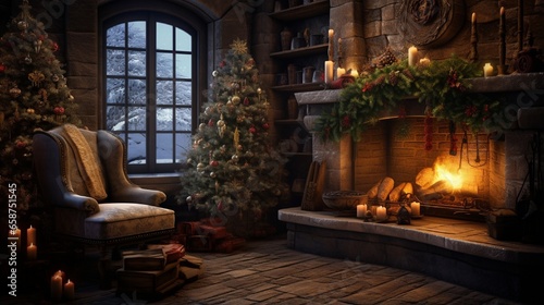 An enchanting Christmas scene featuring a rustic fireplace, cozy armchairs, and a softly lit tree