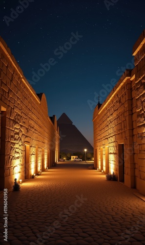 An enchanting view of the illuminated pathway leading to the Great Pyramid at night, showcasing the majestic beauty of ancient Egyptian architecture.