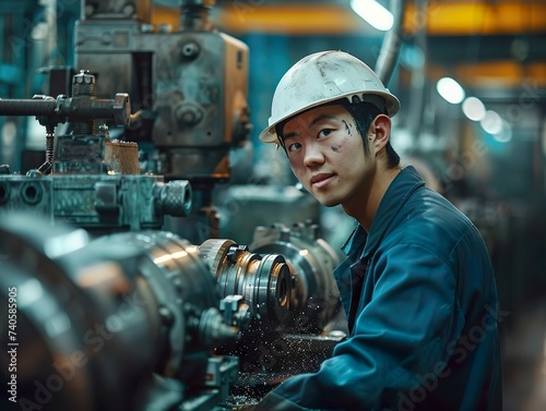 An engineer dressed in a blue jumpsuit and white hardhat operates a lathe machine