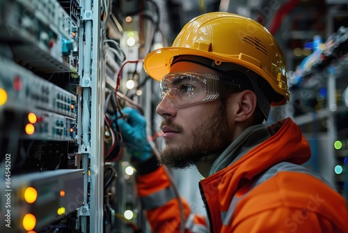 engineer, working, electrical, panel, wire, safety, gear, yellow, hard hat, protective, glove, industrial, complex, workspace, safety-gear, electrical panel, technology, cable, equipment, maintenance, technical, profession, sharpened, detail, attentive, intricate, systematic, controlled, professional, modern, engineering, precision, electronic, machinery, power, circuitry, occupational, indoor