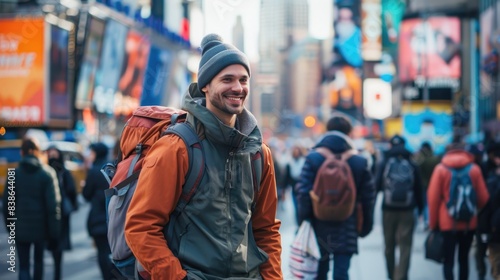 An enthusiastic traveler immerses themselves in the vibrant atmosphere of the city, walking briskly amidst the hustle and bustle with a smile on their face, embodying a dynamic and ambitious spirit,