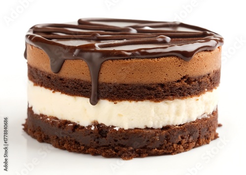 An enticing chocolate dessert layered with creamy filling and topped with gooey chocolate drizzle, embodying indulgence and sweetness in culinary photography.