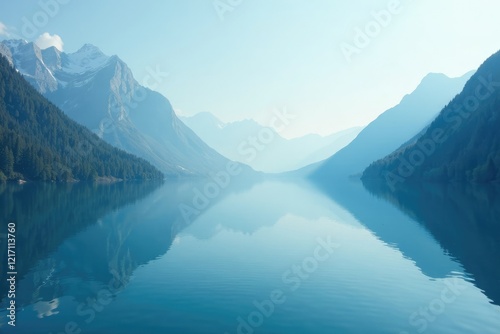 an ethereal blue haze wafts through a still white lake, serenity, calm