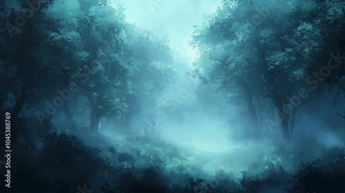 An ethereal forest shrouded in mist, with soft light filtering through the dense trees.