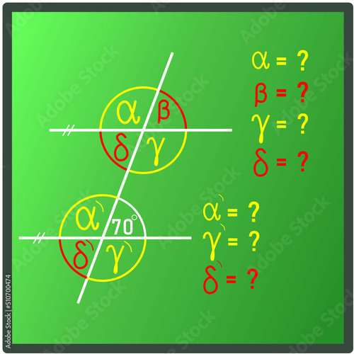 An example from mathematics on a green board - supplementing the sizes of angles using the knowledge of congruent and alternating angles