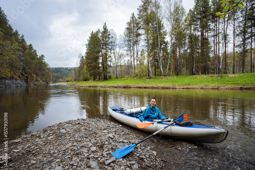 An exciting adventurer enthusiastically kayaking on a serene river while being surrounded by lush, vibrant greenery, which enhances the beauty of the natural landscape and provides tranquility