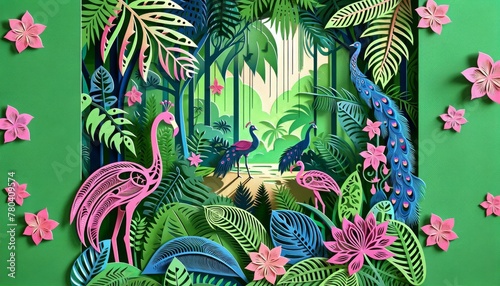 An exotic and mystical rainforest scene, with peacocks and pink flamingos
