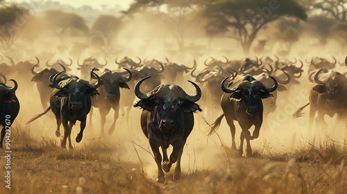 An expansive herd of wild buffaloes galloping across a dusty plain in front of the camera