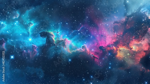 An expansive space galaxy scene featuring colorful nebula clouds swirling with deep blues, vibrant pinks, and luminous purples under a starry night sky.