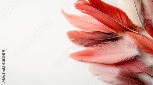 An exquisite arrangement of delicate pink and red feathers on a white background, showcasing artistic beauty while evoking feelings of elegance, grace, and softness in design.