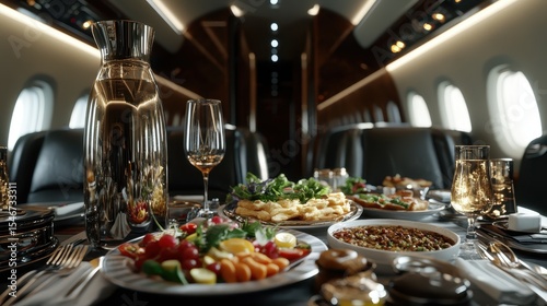 An exquisite dining setup featuring a lavish spread of gourmet dishes on a private jet, exuding luxury, sophistication, and the ultimate travel experience.